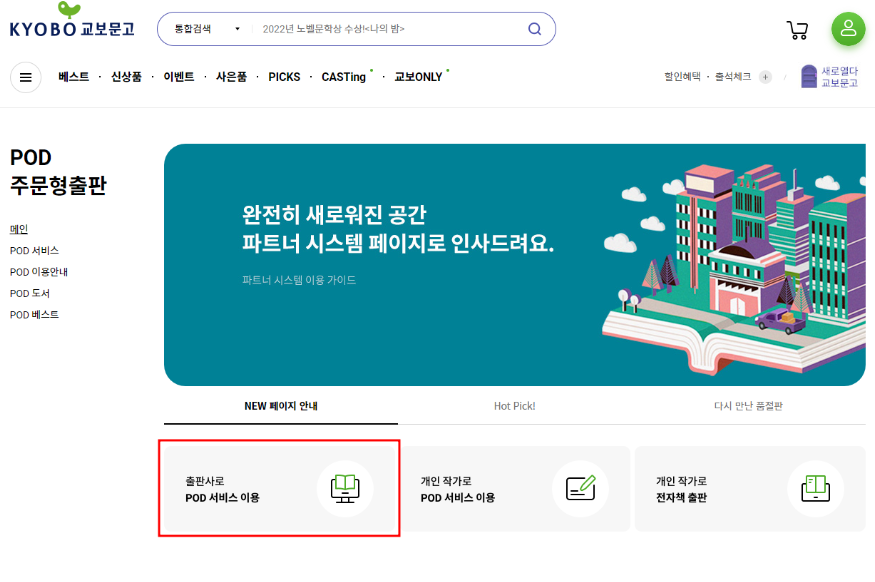 2) 출판사는 출판사, 개인작가는 개인작가로 POD 서비스 이용 클릭 > 파트너시스템 접속